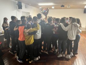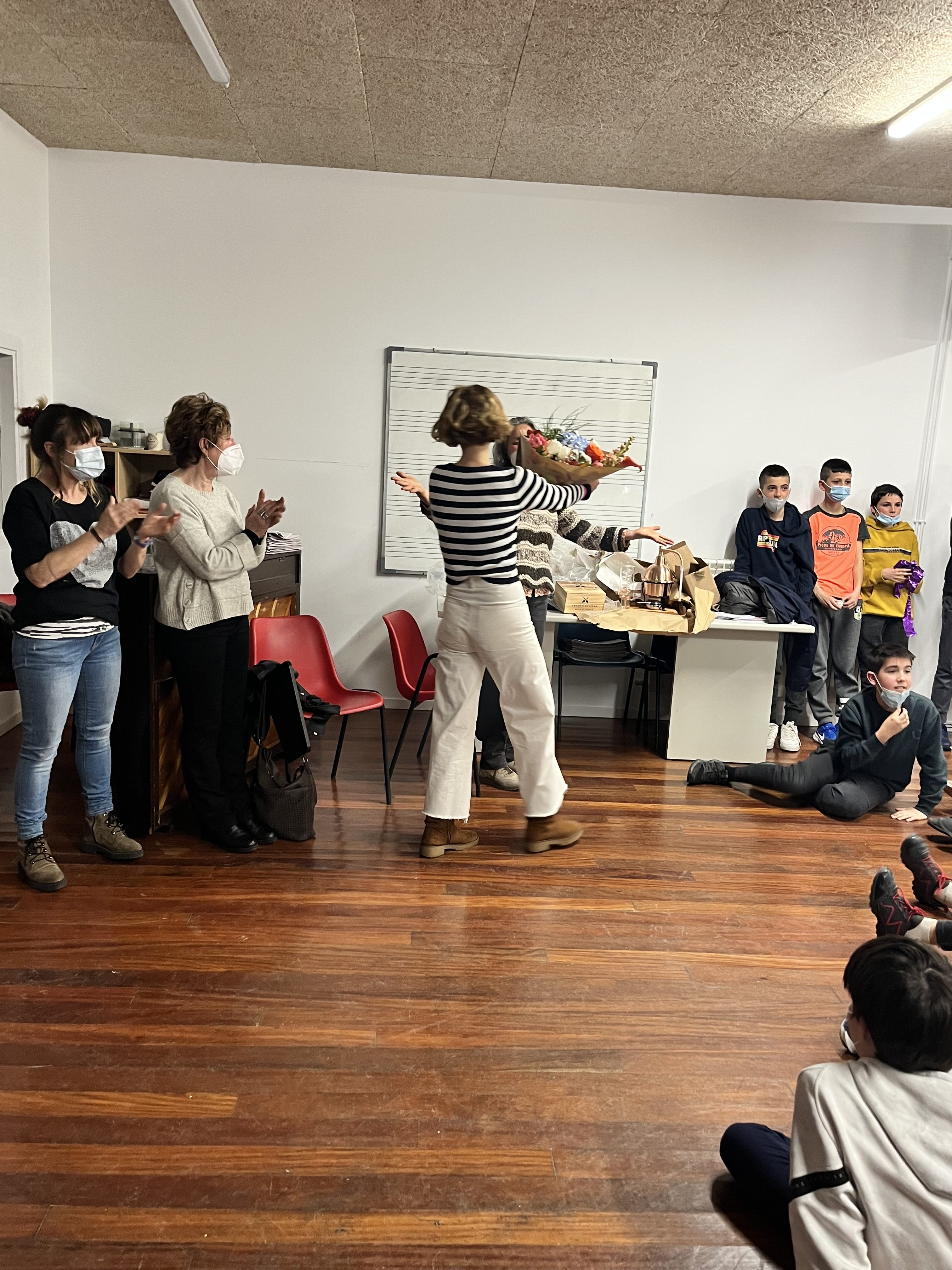 Agurtzeko, ikasleek bertsoak abestu dizkiote, saxoarekin “What a wonderful world” abestu diote, irakasleok agurra dantzatu diogu, “Yellow submarine” abestia moldatu eta abestu dute ikasleek, … eta denak emozionatu gara.