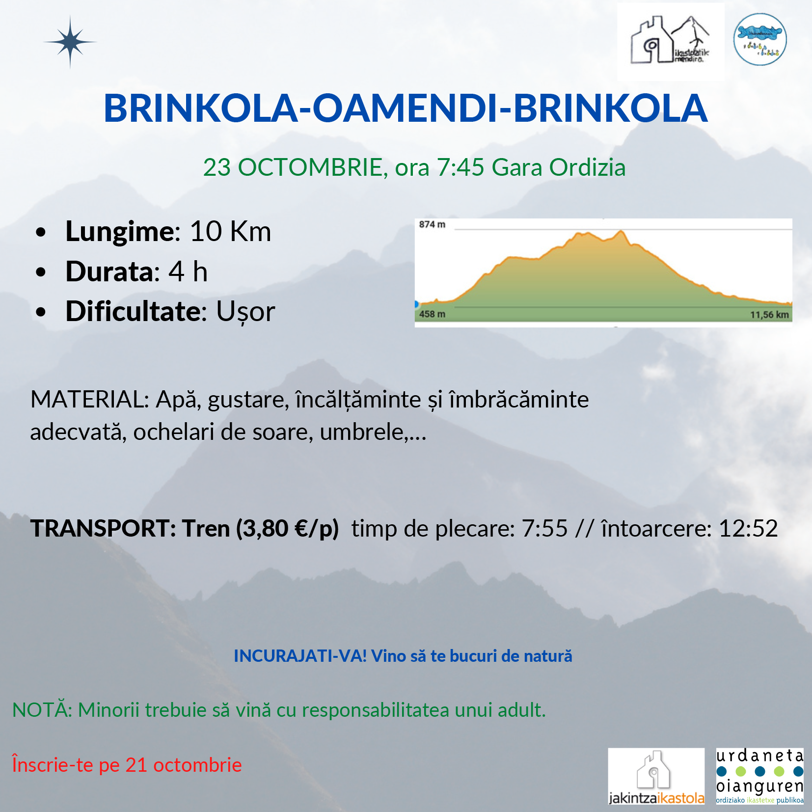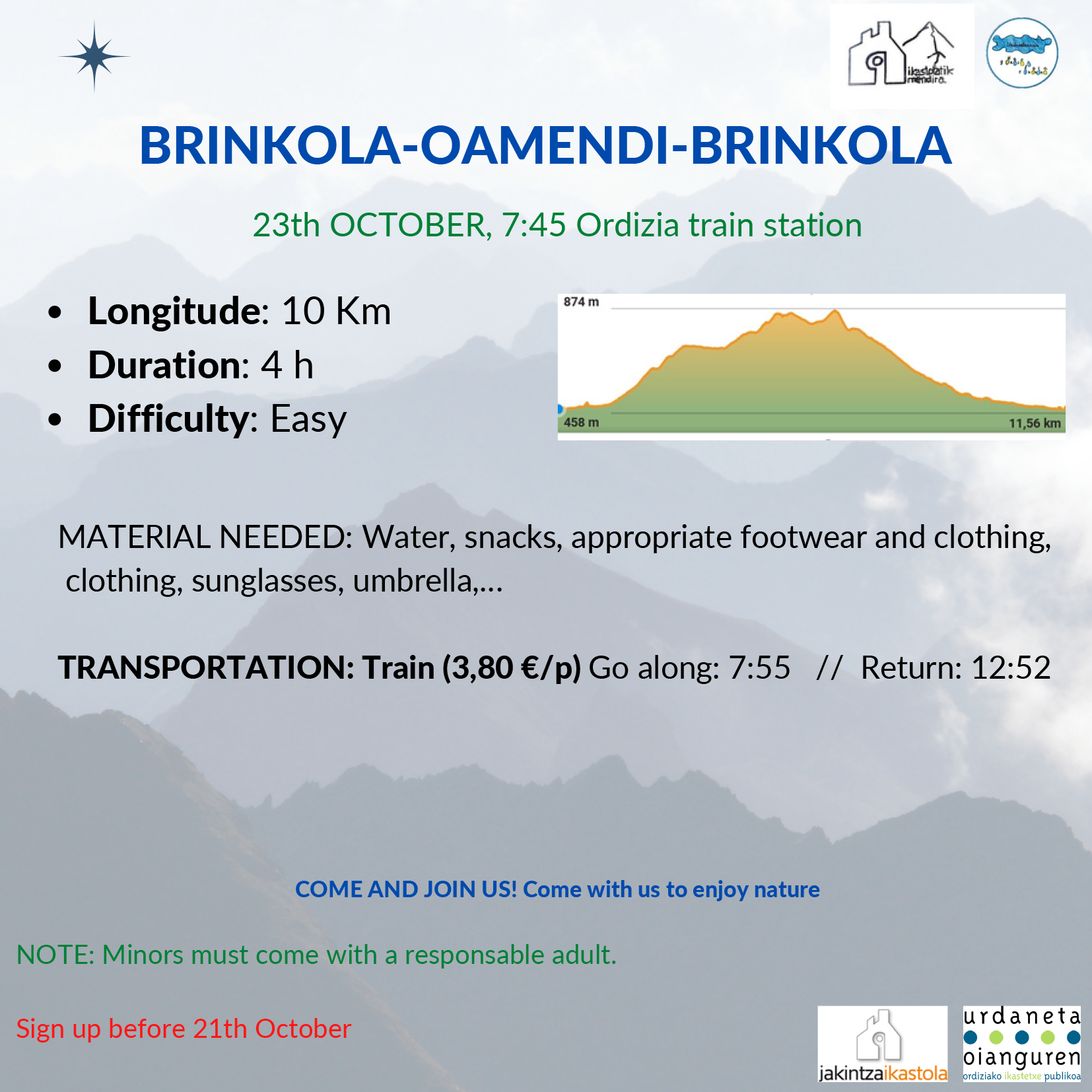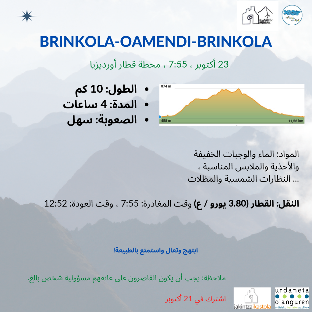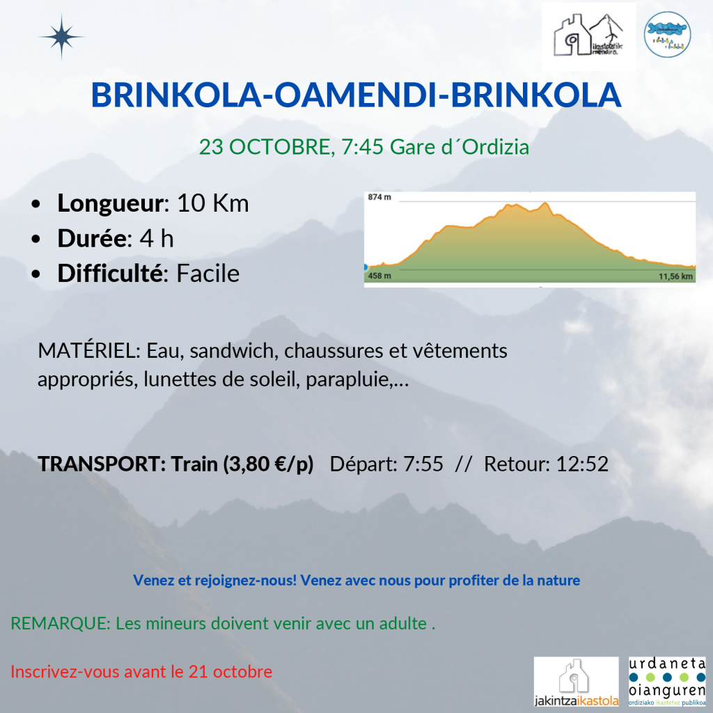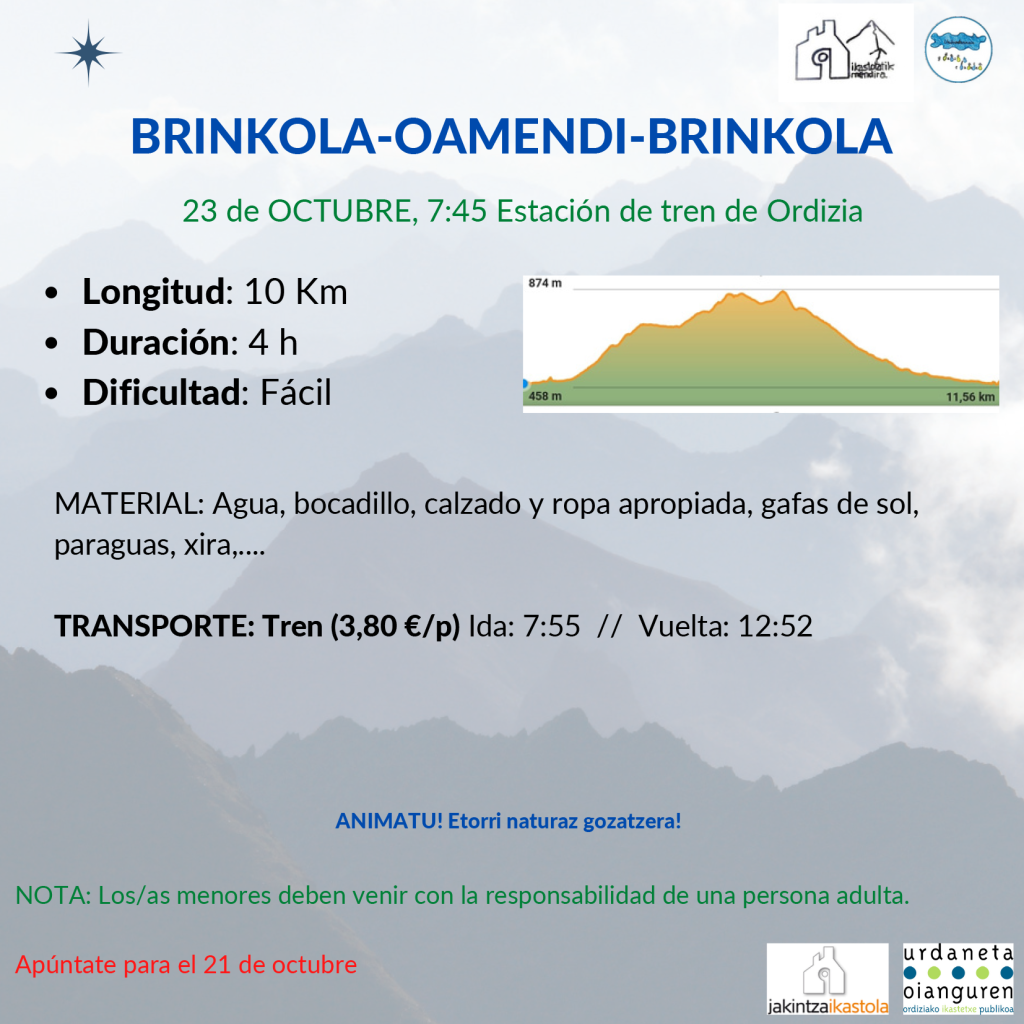 Urriaren 23-an, Ordizian trena hartuko dugu goizeko 7:55-etan (10 minutu lehenago tren geltokian geratu gara). Trenak Brinkolara gertruatuko gaitu eta hemendik, Oamendi eta Arrapileta igoko ditugu. Zirkularra izango da.