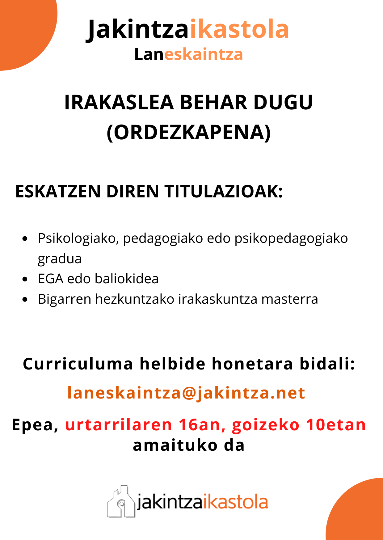 Psikologiako, pedagogiako edo psikopedagokiako gradua duen irakaslea behar da (ordezkapen baterako). ESKATZEN DIREN TITULAZIOAK: Psikologiako, pedagogiako edo psikopedagokiako gradua EGA edo baliokidea Bigarren hezkuntzako irakaskuntza masterra Curriculuma helbide honetara bidali: laneskaintza@jakintza.net Epea, apirilaten 16an amaituko da [...]