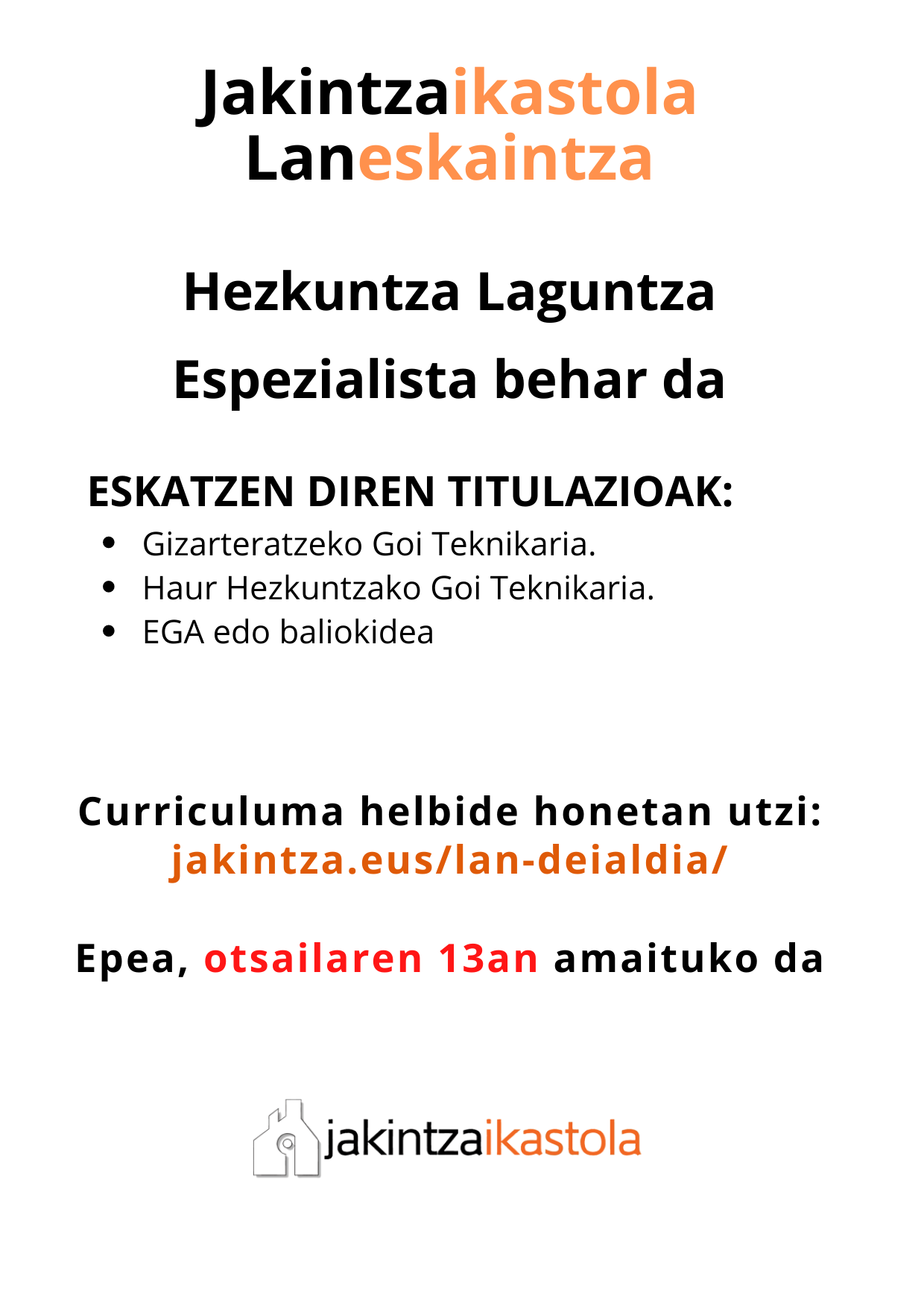 Lan eskaintza - Hezkuntza Laguntza Espezialista behar da: ESKATZEN DIREN TITULAZIOAK: Gizarteratzeko Goi Teknikaria. Haur Hezkuntzako Goi Teknikaria. EGA edo baliokidea Curriculuma helbide honetan utzi: berria.jakintza.eus/lan-deialdia/ Epea, otsailaren 13ean amaituko da