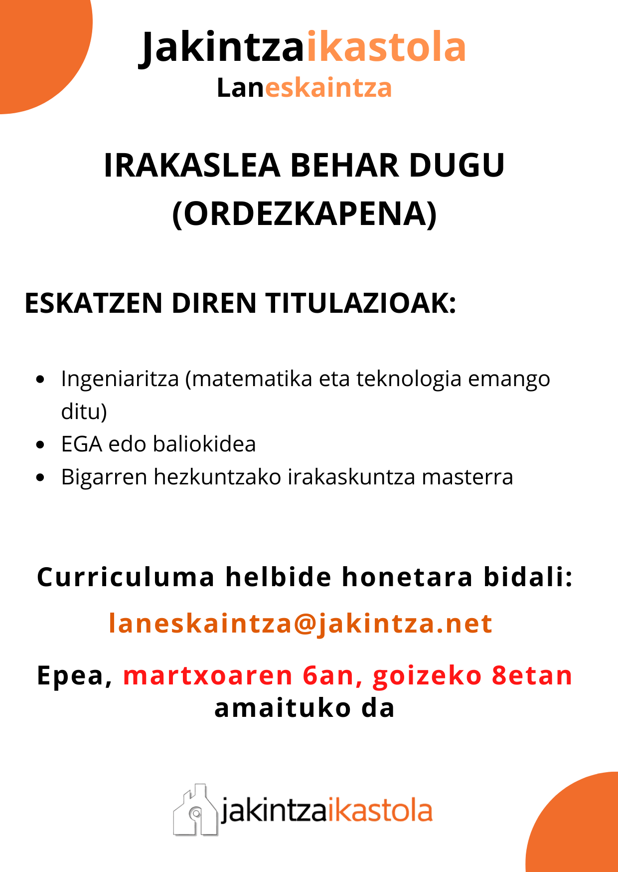 kudeatzailea2023-02-28T10:56:36+01:00ESKATZEN DIREN TITULAZIOAK: Ingeniaritza (matematika eta teknologia emango ditu) EGA edo baliokidea Bigarren hezkuntzako irakaskuntza masterra Curriculuma helbide honetara bidali: laneskaintza@jakintza.net Epea, martxoaren 6an, goizeko 8etan amaituko da
